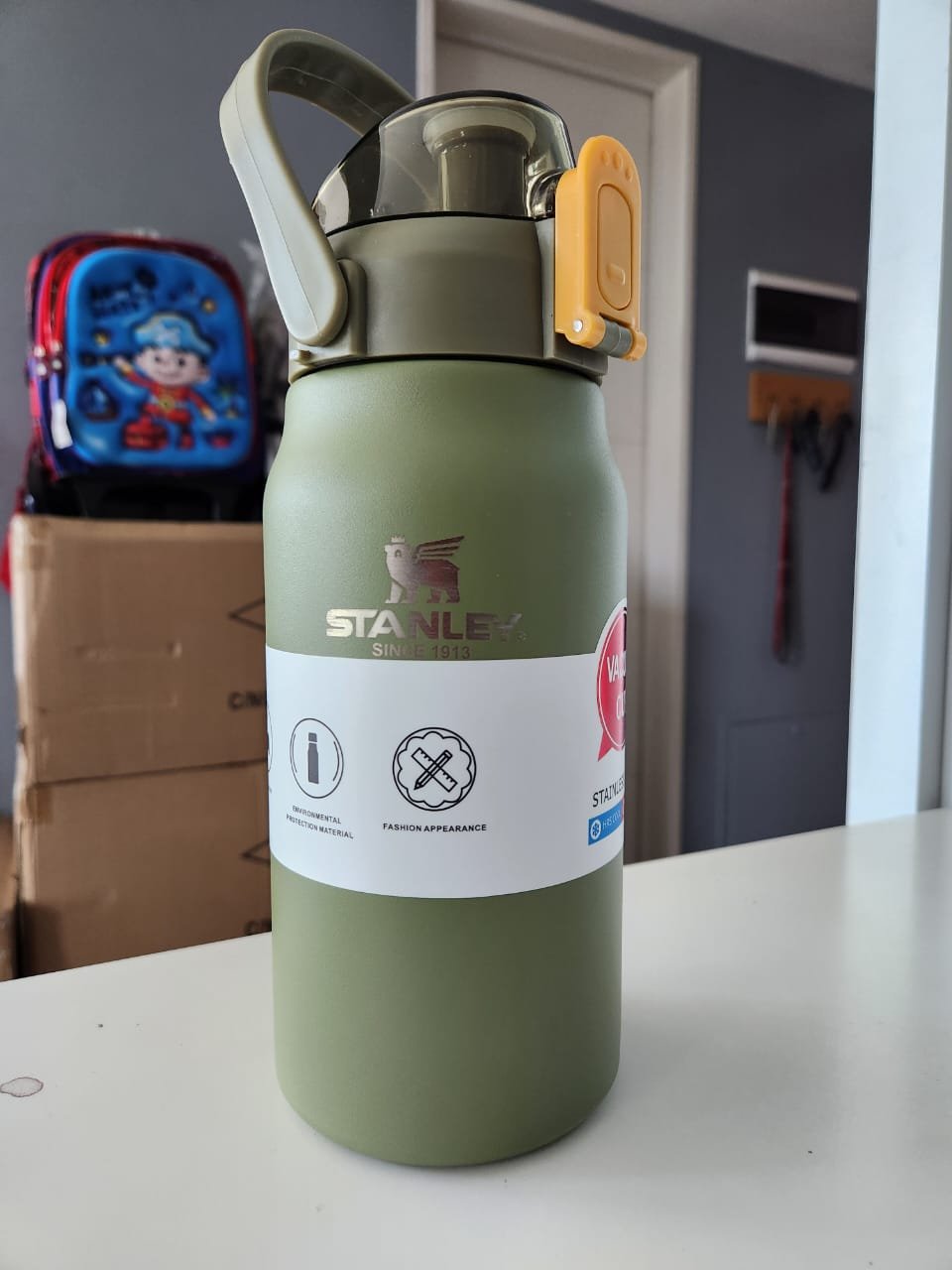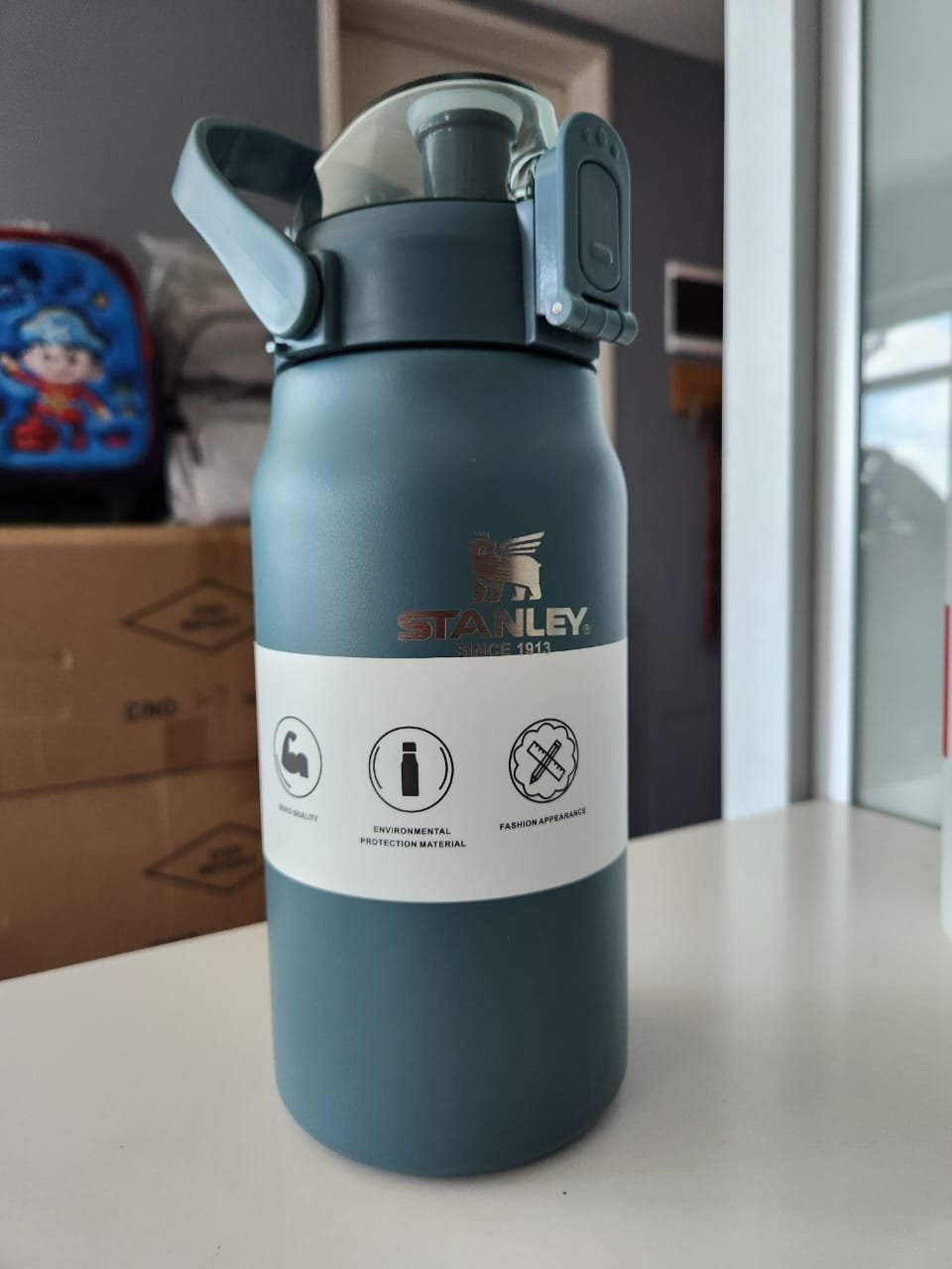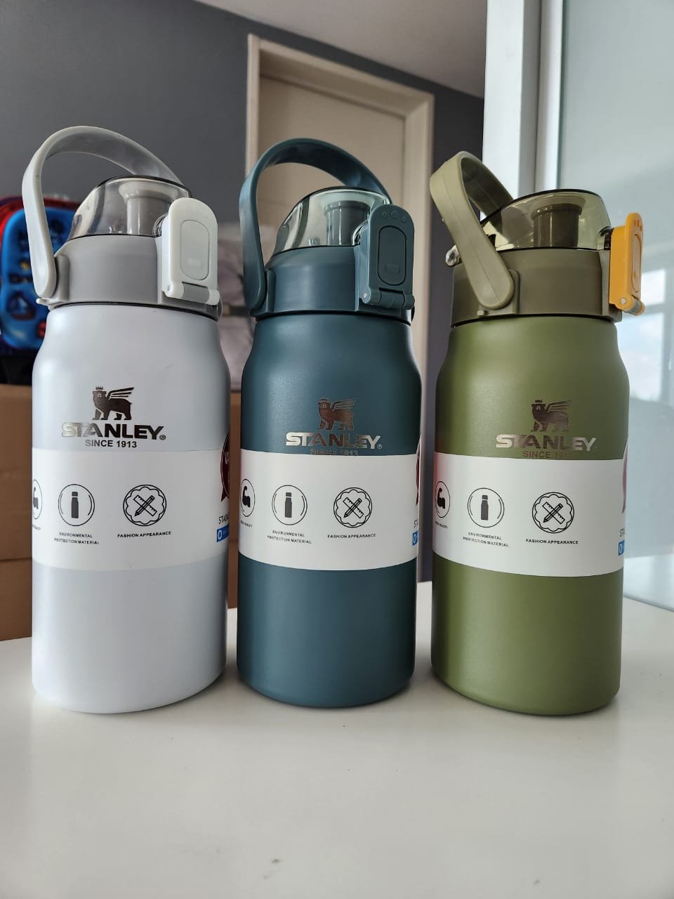 BOTELLON STANLEY CON TAPA DE SEGURIDAD DOBLE – CUERPO DE ACERO INOXIDABLE – MANIJA PARA TRASLADO – MANTIENE TU BEBIDA POR 8 HORAS YA SEA FRIA O CALIENTE – COLORES DISPONIBLES EL BLANCO/AZUL/VERDE